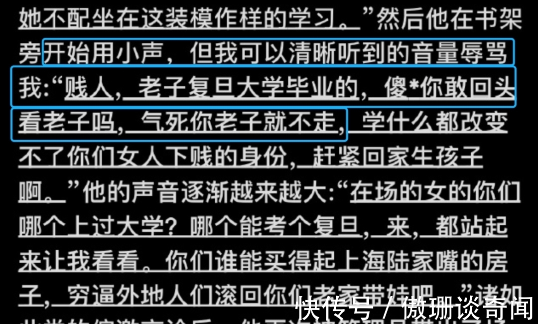 他再次找到了那位正在认真记笔记的女生,站在她背后絮絮叨叨,嘴里不断嘟囔着污言秽语,说读什么书都改变不了她下贱的身份,说他自己是湖南大学毕业的(也有人说是读音相近的复旦大学)。