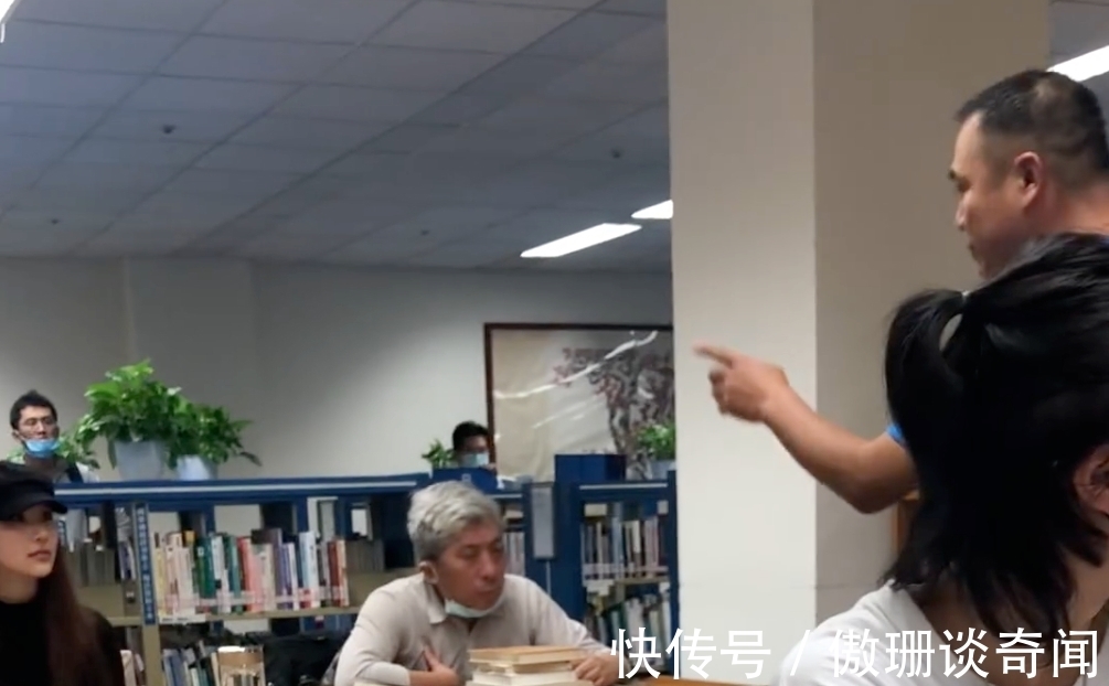 男子则是一副被点破后恼羞成怒的模样,无视图书馆工作人员的阻拦,站在桌边旁指着女生大声辩驳。